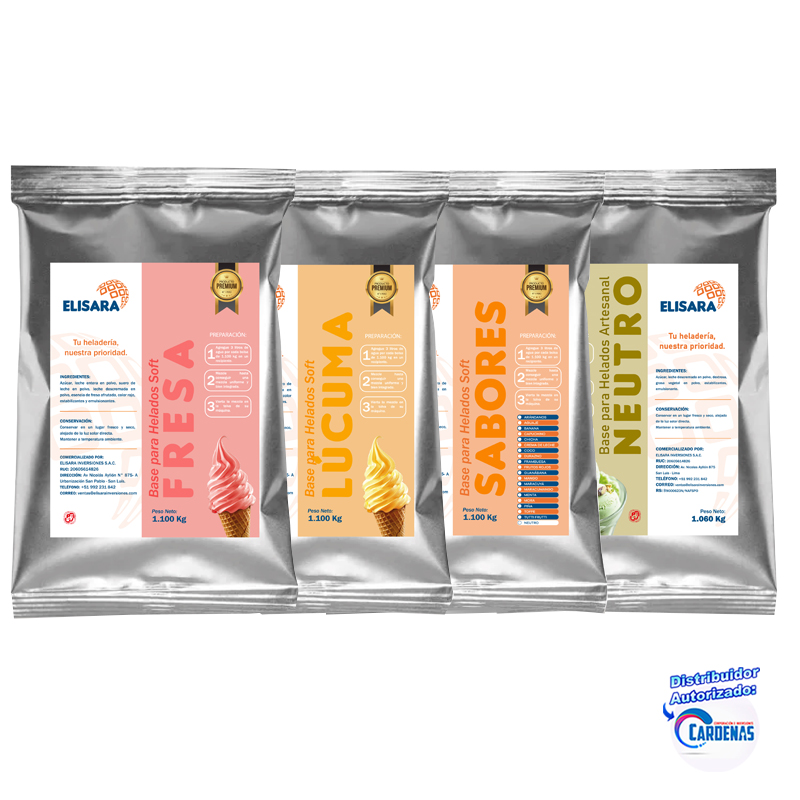 SABORES: LUCUMA, FRESA , COCO, GUANABANA, MENTA, CREMA DE LECHE, MANZANA, PIÑA, MARACUYA, MANGO, MORA,FRAMBUESA, TOFFE, CAPUCHINO, TUTTI FRUTI, MARACUMANGO.