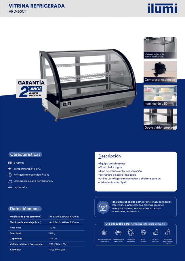 Nuestra vitrina refrigerada de sobremesa es la solución perfecta para exhibir alimentos fríos mientras se conservan en óptimas condiciones. Gracias a su diseño compacto y elegante, se adapta fácilmente a mostradores o barras de atención, permitiendo maximizar el espacio sin sacrificar funcionalidad.
