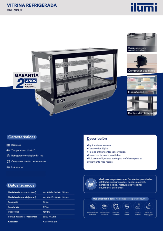 Nuestra vitrina refrigerada de sobremesa es la solución perfecta para exhibir alimentos fríos mientras se conservan en óptimas condiciones. Gracias a su diseño compacto y elegante, se adapta fácilmente a mostradores o barras de atención, permitiendo maximizar el espacio sin sacrificar funcionalidad.